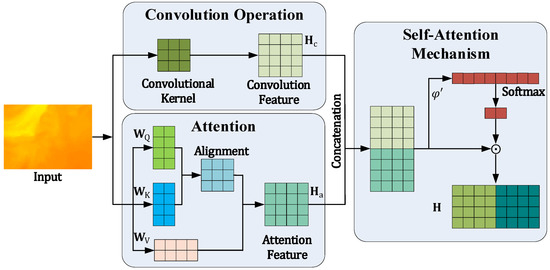 where denotes the captured features via convolution, denotes the convolution layer with weight , and denotes the convolution operator. In the attention layer, the input is projected to query matrix , key matrix , and value matrix , with weights , , and , respectively. The attention output is weighed by the corresponding input values through the matrices of query, key, and value. The attention layer is formulated as: