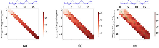 Given the above steps for formulating the MDTW, Figure 5 shows an execution example of MDTW, which shows the process of calculating the shortest path between two groups of multivariate time series using the MDTW algorithm. Figure 5a indicates that the cells of the MDTW distance in a diagonal region are calculated first, and the shortest path is searched within the region. As shown in the figure, the path touches the region boundary at (10,9); at this time, it is necessary to extend a diagonal region to both sides of the region. Subsequently, Figure 5b shows the region of the MDTW distance after the expansion, and the path touches the region boundary again at (2,4), and needs to be expanded again. Then, Figure 5c shows the region after another expansion and, finally, generates the MDTW shortest path.