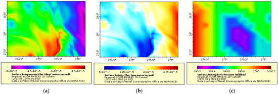 Examples of data samples in the dataset. (a) Surface temperature flux, (b) surface salinity flux, (c) surface atmospheric pressure [26].