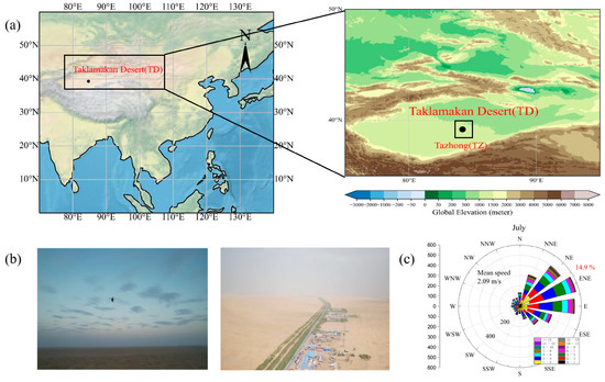As shown in Figure 1a, the TD, located in the Xinjiang Province, China, is a typical arid zone. TZ (39 00′N, 83 63′E, 1140 m) is located in the hinterland of the TD, where dust activity is frequent and intense, and flowing sand dunes account for more than 80%. The temperature varies greatly, with a maximum temperature of 44.2 °C and a minimum temperature of 18.6 °C during our observation period. Precipitation in TZ is extremely scarce, with an average annual precipitation of 26 mm in recent years, which is 37.3% lower than the average precipitation in surrounding regions [43]. Our intensive field experiment was conducted in TZ during July 2021. The experimental location was selected near a desert road at a distance of approximately 50 m, surrounded by several restaurants. Sand dunes (height of 30–150 m) surrounded the observation location from which the UAV was operated (Figure 1b). TZ is primarily crossed by winds traveling from the northeast, east, and north in July, with a 14.9% frequency of easterly winds and an average wind speed of 2.09 m/s near the surface (Figure 1c).