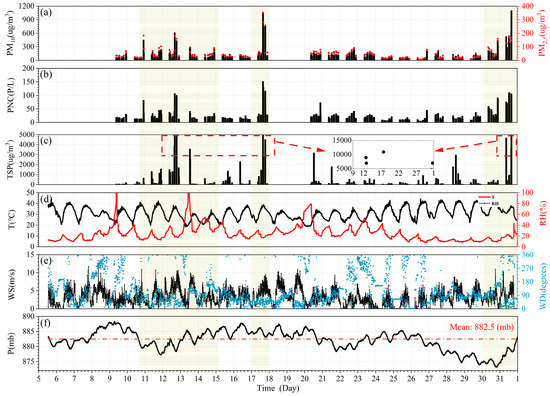 As shown in Figure 2d–f, during the observation period, the mean values of temperature and pressure in TZ were 30.77 °C and 882.5 hPa, respectively, and were mainly influenced by the northeast and east traveling winds with an average wind speed (WS) of 3.13 m/s. The PMs mass concentration and PNC within 10–30 m above ground level were averaged to represent particle variation over the entire observation period (Figure 2a–c). On 12, 17, and 31 July (19:00–22:00), the values of PM10, PM2.5, PNC, and TSP increased rapidly, and the maximum values of PM10 and TSP exceeded 500 μg/m3 and 6000 μg/m3, respectively, considering that a dust-storm event occurred during these three days. The overall trend of PM mass concentration and PNC increased in the days before the occurrence of dust storms on 12 and 31 July, when the pressure was lower than the average pressure and daily maximum temperature gradually decreased. The constant high temperatures and high ground WS, as well as the ample dust sources in the surrounding environment, contributed to the high dust concentrations in TZ. The largest dust storm during the experiment occurred on the night of 17 July, in which TSP, PNC, PM10, and PM2.5 were all higher than those on 12 and 31 July. Near-ground TSP, PM10, and PM2.5 were 6000–12000, ~1100, and 380 μg/m3, respectively. Before the dust storm, the PM mass concentration and PNC values were low, and there was no significant trend in the barometric pressure or daily maximum temperature; however, the WS was at a high level throughout the day. As shown in the observation records (yellow shading), there were continuous dusty weather occurrences from 19:00 to 10:00 on 10, 17, and 30–31 July, with a significant reduction in visibility in the afternoon and evening. The dust storms on 12 and 31 July were mainly influenced by larger weather systems that lasted longer, whereas 17 July was influenced more by near-surface winds and experienced a slightly shorter duration of dust storms driven by small-scale weather systems.