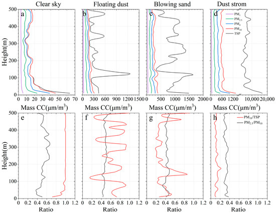 According to the criteria given in Table 1, four flights were selected to present the vertical characteristics of mass concentration changes under different situations. As shown in Figure 3, the PM mass concentrations in the different size fractions increased significantly from clear sky, floating dust, and blowing dust to dust storms. For example, the mean TSP during a dust storm is 5348.8 µg/m3, which is approximately 6 and 15 times higher than that of blowing dust (938.1 µg/m3) and floating dust (361.1 µg/m3) scenarios, respectively, and 318 times higher than that of the clear sky (16.8 µg/m3). The mass concentration ratio decreased for the four scenarios when small particle size fractions were considered. For instance, the average value of PM1 during a dust storm was 44.4 µg/m3, which is 1.2, 1.8, and 13.4 times higher than those during blowing sand, floating dust, and clear sky, respectively. This indicates that the contribution of large particles to the mass concentration had a significant effect on this ratio under different scenarios. During clear-sky periods, the mass concentrations in different size fractions revealed a decreasing trend, with heights below approximately 80 m near the ground, remaining essentially constant above that height. In particular, the profiles for dust storms had a greater decreasing trend than those for clear sky at altitudes below approximately 40 m. As pointed out by [50], the mass concentration distribution varied slightly above 32 m using an 80 m meteorological tower over TZ. The observations reported in the current study are consistent with these results.