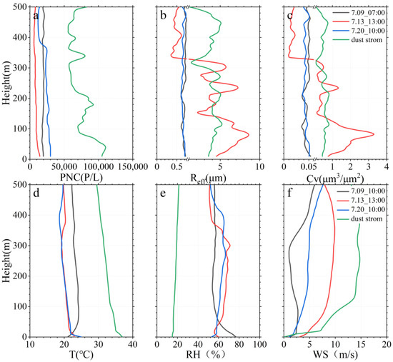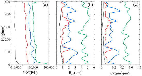 The vertical distribution of PNC, particle effective radius (Reff) and particle volume concentration (Cv) under the four scenarios in the height range of 10–500 m above ground level during the experiment. In detail, floating dust at 13:00 on 31 July (red line), blowing dust at 16:00 on 31 July (blue), sand storms at 19:00 on 17 July (green), and clear sky at 13:00 on 26 July (black).