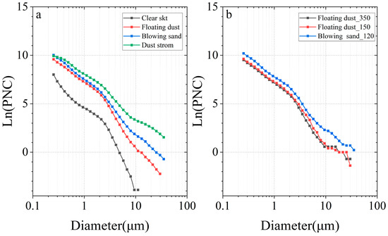 The particle number size distribution (PNSD) for (a) the averaged distribution with a height of 10–500 m under four scenarios, where the corresponding times are the same as those in Figure 3; and (b) three fine-dust layers: 150 m (red) and 350 m (black) under floating dust, blowing sand at 120 m (blue).