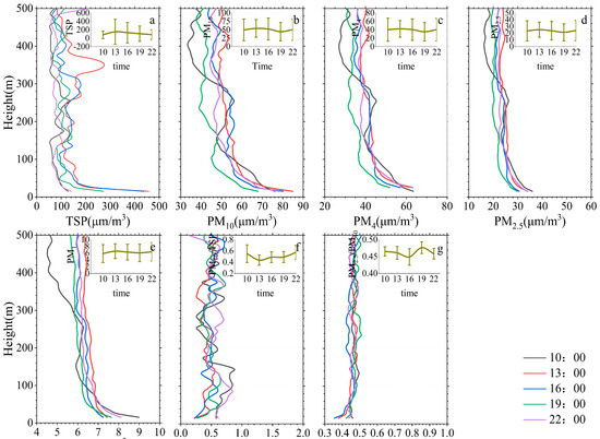 The averaged vertical profiles of PMs, PM10/TSP, and PM2.5/PM10 at 10:00, 13:00, 16:00, 19:00, and 22:00 in the altitude range of 10–500 m above ground level during the experiment. The subfigure (a–g) in the upper right corner shows the average values of PMs, PM10/TSP, and PM2.5/PM10 in the 10–500 m range at different observation times.