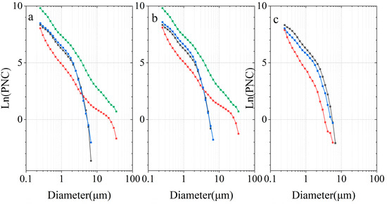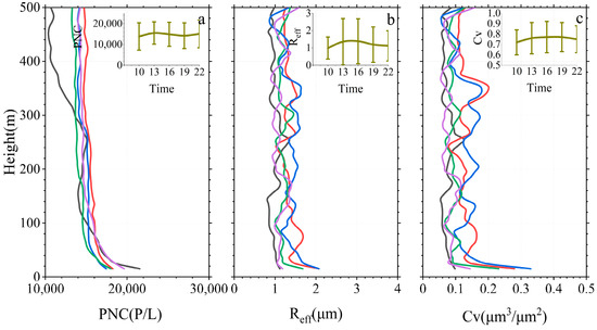 As shown in Figure 7a, PNC also showed a decreasing trend with increasing height, particularly at 10:00. This is because in the experimental region, this stage occurs when the convective boundary layer starts to develop; here, the PBLH is usually less than 500 m. Furthermore, Reff and Cv varied almost constantly with height. The Reff remained approximately in the range of 1–2 μm, while the Cv remained mainly between 0.06 and 1.08 μm3/μm2. Among them, Reff and Cv at 13:00 and 16:00 were considered to be at a maximum level at different heights. The diurnal variation of PNC, Reff, and Cv were similar to those of mass concentration showing a single-peaked distribution, with the peaks occurring at 13:00–16:00, when their values were 15,467 P/L, 1.4 μm, and 0.13 μm3/μm2, respectively.