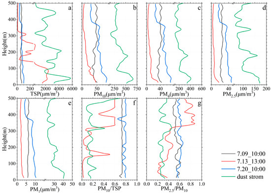 The vertical distribution of PMs (a–e) and the ratios of PM10/TSP and PM2.5/PM10 (f,g) under the three postprecipitation (P1, P2, and P3) and dust storm scenarios in the height range of 10–500 m above ground level during the experiment. P1 at 10:00 on the July 9th (black line), P2 at 13:00 on the July 13th (red line), P3 at 10:00 the July 20th (blue line), and dust storm at 19:00 on the 31th (green line).