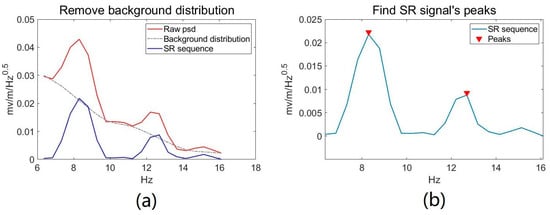 The extraction method of SR parameters: (a) represents the process of removing the background contribution of the original power spectrum of the electric field, and (b) shows the method of locating and extracting the SR parameters.