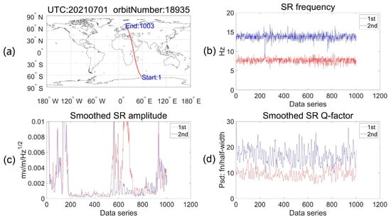 SR variation along the orbit at night: (a) shows the geographical position of the satellite orbit, (b–d) correspond to the SR frequency, amplitude, and quality factor extracted from this orbit, respectively. The red line represents SR’s first mode and the blue line represents SR’s second mode.