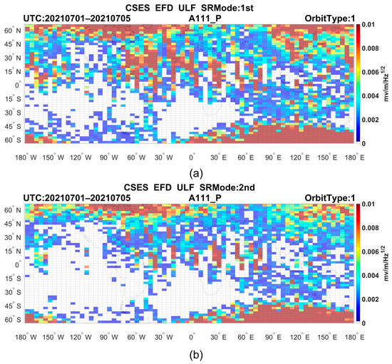 Compared with ground observation, increasing the observation height is beneficial for receiving more abundant electromagnetic information. In 1977, T. Ogawa [55] observed the first seven eigenmodes of SR signals at stratospheric altitude using high-altitude balloons. With the development of space technology, satellite payloads are more sensitive and precise, and electromagnetic satellite monitoring has gradually become the main means of space-physics-related research. Zhao Z.Y. et al. [56] used the ELF electromagnetic observation data of Aureol-3 near Earth’s polar orbit low-altitude satellite on ionospheric electric field disturbance and electron density disturbance at the height of ionosphere layer F, observed SR signals in the electric field component and showed that the SR eigenfrequency occurring in the upper ionosphere is related to the large-scale irregularity and positive density gradient of electron density, which is the first SR research based on satellite data. Later, Ni B.B. and Zhao Z.Y. [41] pointed out that the electric field component observed by the Aureol-3 satellite has a good resonance spectral structure, and the peak frequency corresponds to the various SR eigenfrequencies in the magnetic field component, confirming that the ELF wave field disturbance observed by the Aureol-3 satellite is an electromagnetic oscillation related to SR. In 2011, Simões et al. [57] detected and extracted SR signals at the ionosphere F-layer height using electric field data collected by the C/NOFS satellite during abnormally low solar activity minima. The C/NOFS satellite observes ionospheric electromagnetic signals at the height of the ionosphere F-layer, and can observe significant SR phenomena under nighttime conditions. In 2014, Dudkin et al. [58] extracted characteristic records of ionospheric Alfven resonance and SR using the ULF/ELF electric field observation data of the Chibis-M satellite. Simões and Dudkin [57,58] extracted SR signals based on satellite altitude observations, which proved the spatial SR leakage mentioned by Madden and Thompson [24]. Toledo Redondo et al. [59] used more than four years of electric field data sets from the DEMETER satellite to produce detailed maps of the effective ionospheric reflection height or D-region height, which is inversely proportional to the cutoff frequency. The depiction of the Toledo-Redondo et al. map ranges within 60° north–south latitudes, while the global SR background field based on CSES is within 65° north–south latitudes. The SR background and Toledo-Redondo’s maps both apparently shows anomalous enhancement due to geographic and geomagnetic misalignments. Toledo’s research can support subsequent studies of SR context based on satellite data.