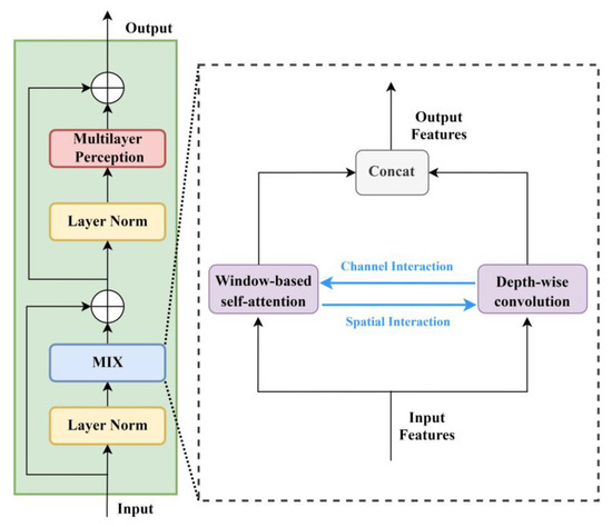 Figure 2, the information extracted by depth-wise convolution is passed through the channel interaction path to the window-based self-attention branch to improve the modeling ability of the network in the channel dimension. In the same way, the information obtained from the window-based self-attention branch is passed through the spatial interaction path to the depth-wise convolution branch to enhance the modeling ability of spatial dimension.
