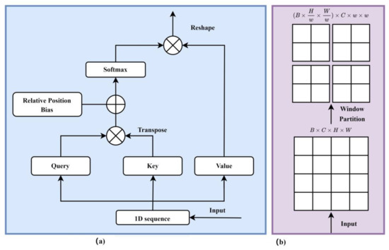 Figure 3. The computation process of window-based self-attention is as follows. The 2D feature map is first partitioned into 8 × 8 windows, and the 2D features are flattened into 1D sequence. Then self-attention is performed inside the window. The number of channels of the 1D sequence is expanded 3 times by a linear layer and then split into three vectors: query (