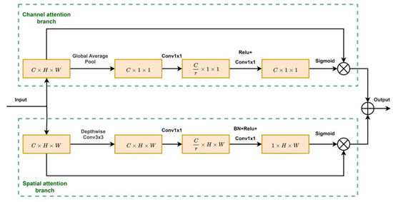 by a global average pooling layer, where C represents the channel dimension. The two 1 × 1 convolution operations first compress the number of channels of the feature to 1/16 times, then restore it to the original number of channels. The channel attention map is generated by the sigmoid function. The spatial attention branch uses depth-wise convolution to strengthen information in spatial dimension and then passes two 1 × 1 convolutions, and BN and ReLU. With two convolution layers, the number of channels is reduced to 1. The channel and spatial attention maps are multiplied by the original input features, and the refined feature maps are generated by feature fusion.