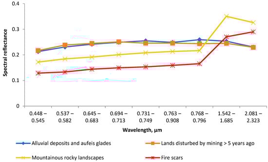 As noted above, land impacted by gold mining has similar spectral characteristics to natural bare areas. We compared the spectra based on Sentinel-2 images (L2A processing level), obtained in mid-summer of 2022. Several mining sites, as well as natural alluvial deposits, mountainous rocky wastelands, and burned areas, were selected to calculate their spectral characteristics (test areas included several hundred pixels for each class). Then, spectral reflectance was averaged for them (Figure 2). All these classes have close-to-zero NDVI values. Spectral characteristics of natural alluvial deposits almost do not differ from the same of mining areas, while mountainous rocky landscapes and especially burned areas have, on average, lower reflectance in visible and near-infrared bands, and higher reflectance in shortwave and mid-infrared bands. However, maximum and minimum values of spectral reflectance for mining sites, fire scars, and mountainous rocky landscapes overlap, which indicates a substantial likelihood of confusion between these classes []. This indicates the need to use the above-mentioned additional information (Table 1) to identify gold-mining areas from satellite images.