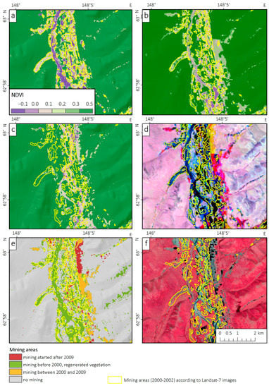 Data processing was performed using the Google Earth Engine [] and included such steps as the compilation of the initial dataset consisting of Landsat-5,7,8 collections, cloud masking, and the calculation of NDVI values. In total, we used 10 images from Landsat-7 (for 2000), 27 images from Landsat-5 (for 2009), and 31 images from Landsat-8 (for 2021). All images were obtained for the period from 15 July to 10 September, which approximately corresponds to the vegetation period in the studied basin of the Berelekh River. Annual NDVI maximums were calculated for each pixel. Next, a multi-temporal image of three NDVI maximum bands calculated for 2000 (according to Landsat-7 data), 2009 (according to Landsat-5 data), and 2021 (according to Landsat-8 data) was created (Figure 5d). A 10-year time step was chosen since the revegetation process in the dumps takes a long time [].
