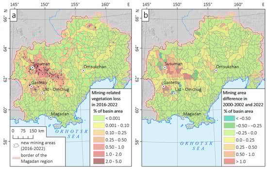 Mining-impacted areas are concentrated in the western part of the Magadan region, namely in the Susuman, Ten’kinsky, and Yagodninsky municipal districts, which are related to the Kolyma gold belt []. Thus, gold mining along the Berelekh River and its tributaries began over 80 years ago and continues at the present [], which determines the most severe impact on the natural environment. According to the Sentinel-2 images of 2022, mining sites with totally removed vegetation canopy occupy 1.69% of the total area of the Berelekh River basin (~16,500 ha) and 1.47% of the adjacent Debin River basin (~8000 ha), which makes up one third of the total mining area in the Magadan region. In several sub-basins, the contribution of severely impacted mining areas reaches 5% (Figure 7). On the contrary, in other parts of the region, gold production is carried out in isolated deposits, and the proportion of the impacted area is less than 1%, except for one basin near the town of Omsukchan.