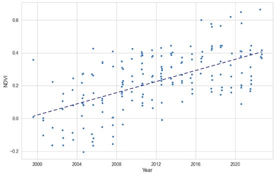 To confirm the vegetation recovery process, we selected three test sites classified as recovered vegetation (shown in Figure 10). For each of them, the average NDVI was calculated for July and August for the periods 1999–2022 (based on Landsat-7 images) and 2014–2022 (based on the Landsat-8 images). In total, 188 NDVI values were extracted from the Landsat-7 data, and 135 from the Landsat-8 data. Figure 11 shows NDVI calculated from the Landsat-7 images. We calculated trends for both annual average and maximum NDVI values using the Theil–Sen estimator, and significance was obtained with the nonparametric Mann–Kendall test. Both trends are statistically significant at a significance level of 0.05, and Sen’s slope coefficients are 0.018 and 0.020, respectively, for annual average and maximum NDVI values. Therefore, we found that vegetation recovery is observed according to satellite images in a substantial area affected by gold mining before 2000, and the area recovered by vegetation is comparable to the area impacted by mining over the past 20 years. It is of note that most of the areas recovered by vegetation are located near the town of Susuman, while new mining areas are more distant from it (located in harder-to-reach places).