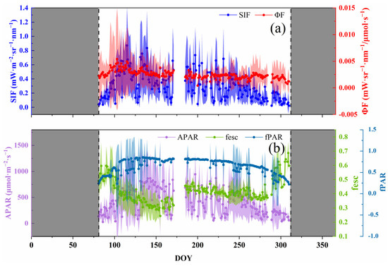 Seasonal dynamics of solar-induced chlorophyll fluorescence (SIF) and intermediate variables (absorbed photosynthetic active radiation, APAR; the fraction of emitted SIF that escapes from the canopy, fesc; the fraction of photosynthetically active radiation, fPAR; fluorescence emission yield, ϕF) ((a): SIF and ϕF; (b): APAR, fesc and fPAR). The shadows on either side of the point are the range of standard deviations of the value. The shaded area on both sides of the axis is the non-growing season.