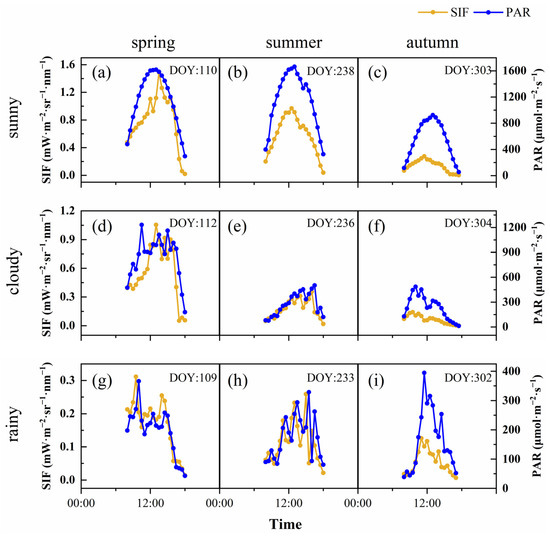 Diurnal dynamics of SIF (yellow line) and PAR (blue line) in spring (sunny (a), cloudy (d) and rainy (g)); summer (sunny (b), cloudy (e) and rainy (h)); and autumn (sunny (c), cloudy (f) and rainy (i)).