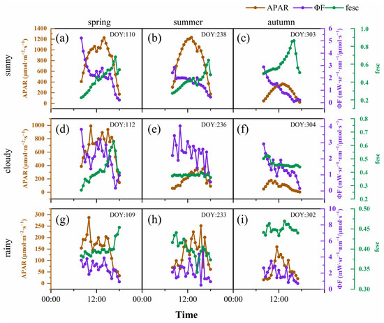 Diurnal dynamics of APAR (brown line); ϕF (purple line); and fesc (green line) in spring (sunny (a), cloudy (d), rainy (g)); summer (sunny (b), cloudy (e), rainy (h)); and autumn (sunny (c), cloudy (f) and rainy (i)). Each subgraph was dated in the upper right corner.