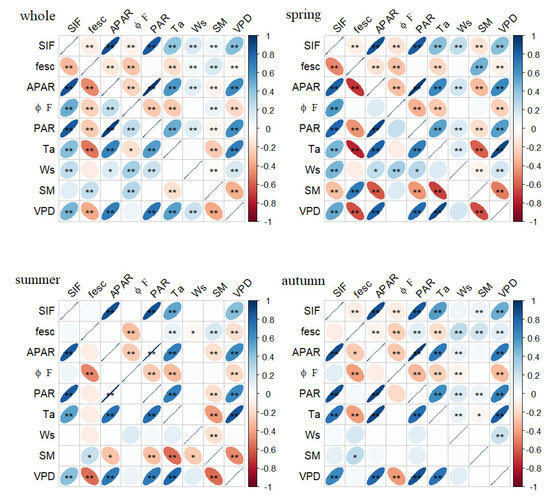 Pearson correlation coefficients between SIF and different environmental factors, in different seasons (whole, spring, summer and autumn). Environmental variations included PAR, Ta, wind speed (Ws), SM and VPD at daily scale (the lower part of each figure) and half-hour scale (the upper part of each figure). Blue means positive correlation; red means negative correlation; and the flatter the ellipse, the stronger the correlation. Note: *—significant correlation at p < 0.05 and **—significant correlation at p < 0.01.