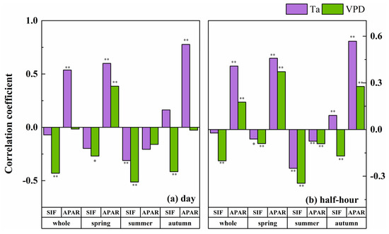 The partial correlation coefficient between different seasonal fluorescence parameters and environmental factors, including Ta (purple bar) and VPD (green bar) in different seasons at the daily (a) and half-hour (b) scales, with PAR as the control variable. Note: *—significant correlation at p < 0.05 and **—significant correlation at p < 0.01.