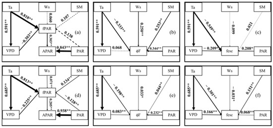 Structural equation model (SEM) path diagram of APAR, ϕF, fesc and environmental factors in daily (a–c) and half-hour (d–f) scales. The thickness of the line represents the value of the path coefficient. All the relationships shown in the figure are significant (p < 0.05). The dashed line means the relationship is not significant and the solid line means the relationship is significant. Note: *—significant correlation at p < 0.05 and **—significant correlation at p < 0.01.