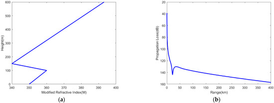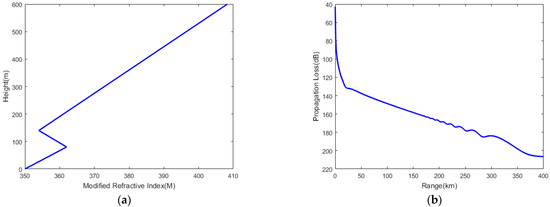 Simulated atmospheric duct profile and path propagation loss. (a) Atmospheric duct profile; (b) path propagation loss of AIS signal.