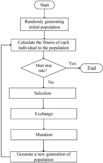 The genetic algorithm (GA) was proposed by Holland in 1975 as an adaptive global optimization probability search algorithm that simulates the genetic and evolutionary processes of living organisms in natural environments [28,29,30]. The core of the GA consists of three steps: selection, exchange, and mutation. A basic flowchart of the algorithm is shown in Figure 6.
