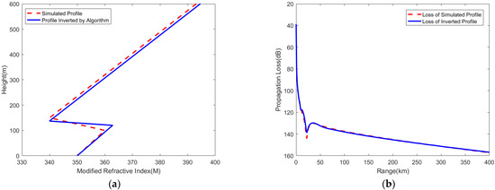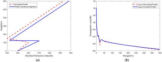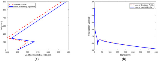 Assuming that the height of the AIS transmitting antenna was 15 m and the height of the receiving antenna was 18 m, the AIS signal path propagation loss simulated based on the PE model was considered as the measured loss. The simulated atmospheric duct profile and path propagation loss diagram are shown in Figure 5.