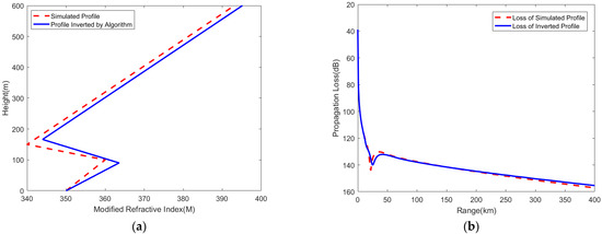 where and are the AIS-measured and PE-model-calculated loss data, respectively, and L is the length of . A smaller value of indicates a higher degree of matching of the inversion results. When satisfies the termination condition or the algorithm reaches the maximum number of iterations, the inversion results are retrieved. The inversion result in this study was a single approximate atmospherically modified refractive index profile, equivalent to the profile of the AIS signal propagation path, which differs from sounding and provides a vertical profile.