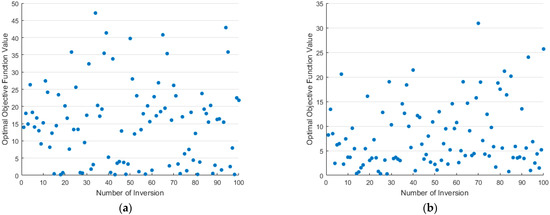 Inversion results under different numbers of calculations. (a) PSO algorithm; (b) SAPSO algorithm.