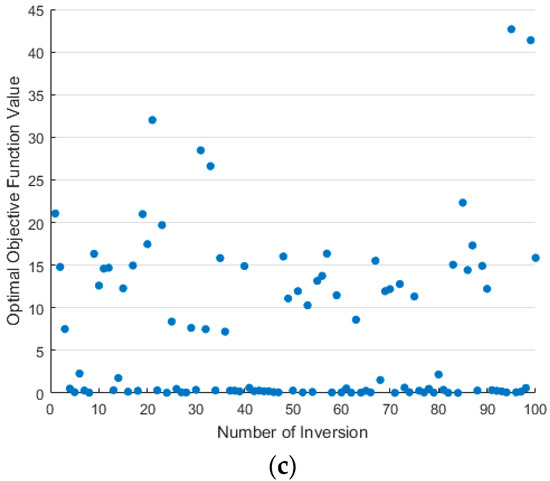 Optimal objective function values obtained from inversion using three intelligent optimization algorithms. (a) GA; (b) SA algorithm; (c) PSO algorithm.