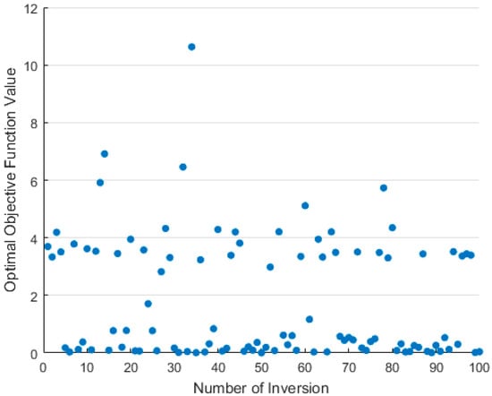 Based on the statistics, the average value of the optimal objective function value retrieved 100 times by the SAPSO algorithm is 1.80, and the result of the PSO algorithm (Figure 12) is 1.84; that is, the inversion effects of the two optimization algorithms are equivalent.
