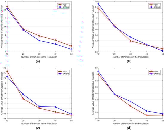 Comparison of PSO and SAPSO inversion results under different numbers of iterations. (a) 10; (b) 20; (c) 30; and (d) 40 iterations.