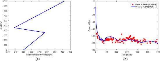 As shown in Figure 21a, a particularly strong lower atmospheric duct exists at this time and direction, and the slope of the bottom layer is 0.077 M/m, the bottom height of the duct layer is 353.9 m, the thickness of the duct layer is 100 m, and the duct strength is 39.2 M. As shown in Figure 21b, the power calculated by the inversion profile is consistent with the power measured by the AIS, verifying the effectiveness of the inversion algorithm.