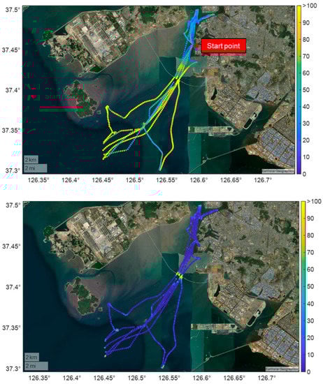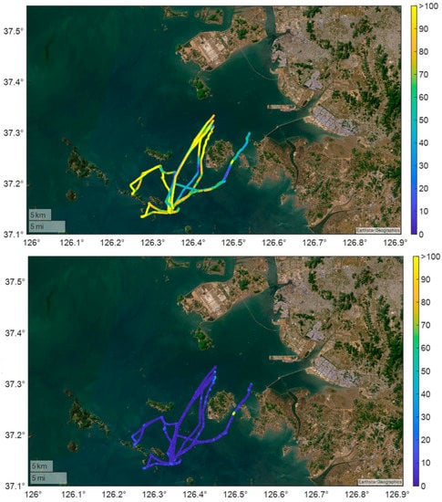 The final experiment was conducted in a far ocean area. Here, the received signal strength from the Incheon testbed transmitter, which transmits 800 W of ERP, was sufficient for navigation; however, it was insufficient to decode LDC messages. This implied that real-time ASF corrections from the differential eLoran station were unavailable. With no correction, the 95% position error in the area was 6880.49 m, and the maximum error was 20,027.36 m. This was expected because of the geometric distribution between the transmitter and user as well as the low SNR of the Incheon testbed transmitter signal.