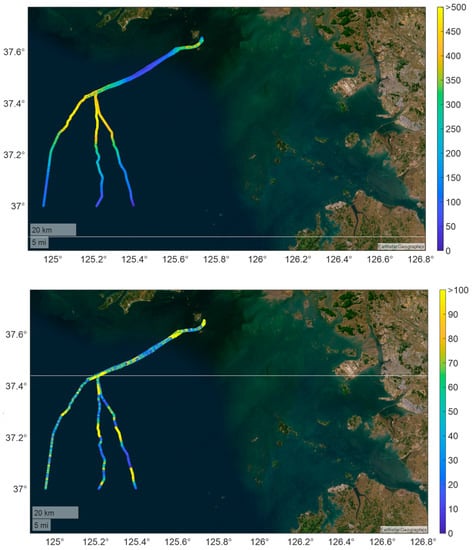 eLoran positioning errors in a coastal area: the top image shows the eLoran positioning errors when the eLoran position was corrected using DGPS at the beginning of the experiment. The bottom image shows the eLoran positioning error when the eLoran position was corrected at 500 m intervals. The numbers indicated in the color bar on the right represent the error in meters.