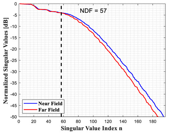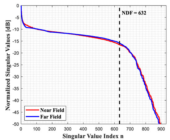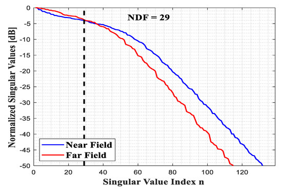 First, we compare the NDF of both the far and near scattered field and compute them numerically by referring to the pertinent far zone operator [23,24] and to (1), respectively. Figure 2 provides a comparison of the behaviours of their normalized singular values. The expected NDF of the far field from (17) is equal to NDF = , as and the numerical results confirm that the NDF in the near field is equal to the NDF of the far field. This result can be expected in virtue of the equivalence theorem, as for each source the corresponding near scattered field has the same NDF of the corresponding far field.