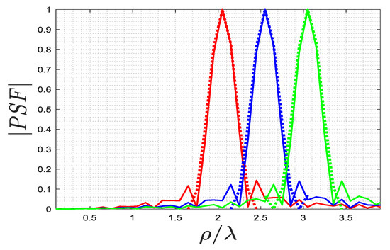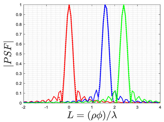 Comparison of the normalized amplitude of the actual (solid lines) and approximated (dashed lines) PSFs for (red lines), (blue lines), and (green lines), when .