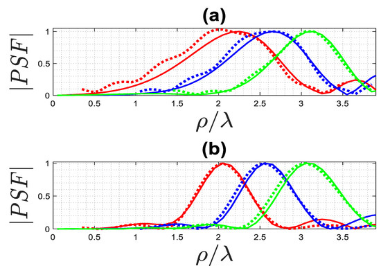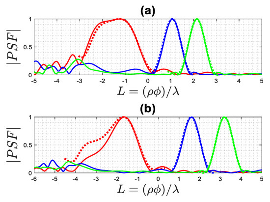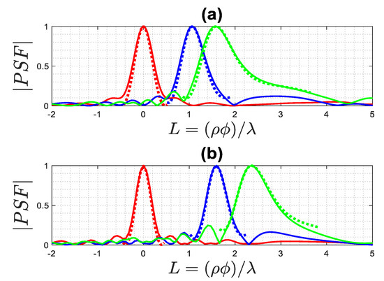 Comparison of the normalized amplitude of the actual (solid lines) and approximated (dashed lines) PSFs for (red lines), (blue lines), and (green lines). (a): , (b): .