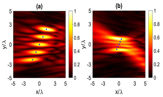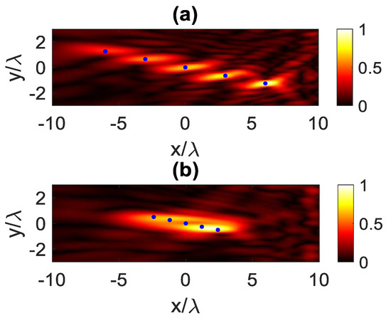 Since the resolution does not depend on the shape of the ID and as shown in the previous example is large, therefore, we consider a rectangular geometry with and to reconstruct five point-like scatterers located on an oblique line within ID. In this case, the NDF is equal to 68 (which is computed by the equation provided in the previous example). Figure 12 shows the reconstructed image of the considered points. When the distance between points is equal to the resolution , they can be resolved well, as shown in Figure 12a. On the other hand, if they are positioned at a distance less than the resolution, they appear as a line rather than separable points, as shown in Figure 12b.