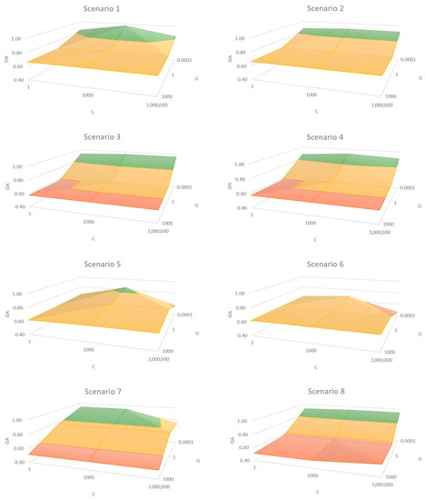 | Features | Mean Layer 2 GLCM Homogen. Max. Diff. GLCM Correlat. Mean Layer 1 GLCM Entropy Mean Layer 3 GLCM Mean St. Dev. Layer 3 Brightness St. Dev. Layer 2 St. Dev. Layer 1 | GLCM Correlat. Mean Layer 2 GLCM Homogen. Max.Diff. Mean Layer 1 GLCM Entropy GLCM Mean Mean Layer 3 Brightness | St. Dev. Layer 1 Mean Layer 2 GLCM Homogen. GLCM Correlat. Mean Layer 1 GLCM Entropy Max. Diff. GLCM Mean St. Dev. Layer 3 St. Dev. Layer 2 Brightness GLCM Dissimilar. GLCM StdDev Mean Layer 3 | Mean Layer 1 GLCM Homogen. Mean Layer 2 Max. Diff. GLCM Mean GLCM Entropy Brightness GLCM Correlat. | GLCM Homogen. GLCM Correlat. Max. Diff. GLCM Mean St. Dev. Layer 2 Mean Layer 1 GLCM Entropy St. Dev. Layer 1 Mean Layer 2 | GLCM Correlat. St. Dev. Layer 2 St. Dev. Layer 3 | Mean Layer 1 Max. Diff. GLCM StdDev Mean Layer 2 St. Dev. Layer 1 GLCM Mean GLCM Correlat. GLCM Homogen. Brightness St. Dev. Layer 2 GLCM Entropy | Mean Layer 2 Mean Layer 1 Max. Diff. GLCM StdDev GLCM Mean Brightness GLCM Correlat. St. Dev. Layer 1 St. Dev. Layer 2 GLCM Entropy |
