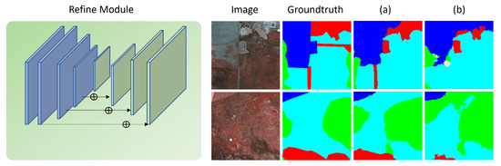 On the left is a schematic diagram of the refinement module. On the right is the segmented contrast image with and without the refinement module, (a) represents the segmented image with the refinement module, and (b) represents the comparison image without the refinement module. Different colors in the image represent different segmented objects.
