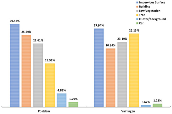Proportion of each semantic label in the Vaihingen and Potsdam datasets.