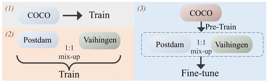 Our three different training strategies. Scheme 1 involves training only on a large-scale image dataset, specifically the COCO dataset. Scheme 2 involves training solely on remote sensing datasets, namely the Potsdam and Vaihingen datasets. The third Scheme is to perform pre-training on a large-scale image dataset and then conduct primary training on remote sensing datasets.