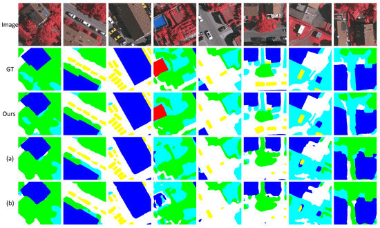 Comparison of segmentation results on the Vaihingen dataset. (a) represents the Swin Transformer and (b) represents the Vision Transformer.