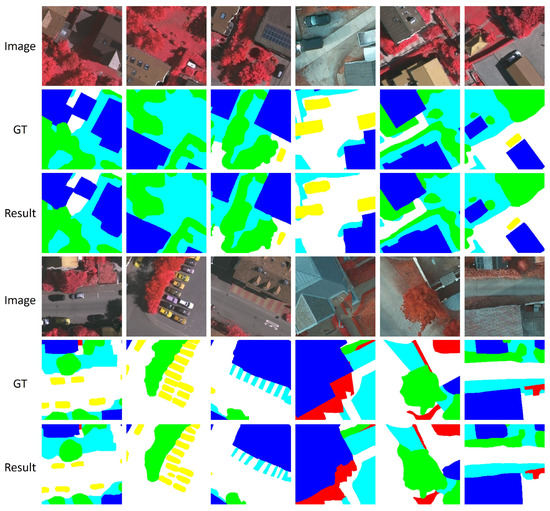 Figure 9 illustrates the segmentation outcomes achieved by our method on the Potsdam dataset. Our method’s efficacy in segmenting complex objects is commendable, which is a direct consequence of employing the Spatial-Aware Transformer algorithm. For instance, a close examination of the images in the second and fourth rows of the first column reveals intricate objects adeptly segmented. Moreover, our model excels in handling objects with convoluted edges, owing to the integration of the Boundary-Aware Refinement module. This is particularly evident in the images located in the first row of the third column and the fourth row of the third column, where the segmentation of objects with intricate edges is astutely precise. Figure 10 shows the segmentation performance of our algorithm in more complex environments, with images derived from the results of the Vaihingen dataset and the Potsdam dataset.