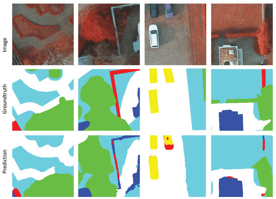 The Potsdam dataset is a popular benchmark dataset provided for 2D Semantic Labeling. The ground sampling distance is approximately 5 cm, offering high detail. The dataset provides corresponding ground truth images where each pixel has been labelled with one of six categories, as shown in Figure 5. In the course of our experimental process, each image within the dataset is constituted by three distinct channel combinations: namely, Infrared-Red-Green (IR-R-G), Red-Green-Blue (R-G-B), and a four-channel variant Red-Green-Blue-Infrared (R-G-B-IR). We employed a dataset comprised of 17 images for training, each possessing the R-G-B channel combination. The remaining seven R-G-B images were assigned for the testing. For both training and testing, the original images were uniformly cropped to patches of pixels to maintain consistency in the data handling and processing workflow.