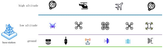 Remote sensing technology has undergone rapid development in recent years. High-resolution satellite remote sensing technology has provided convenience for meteorology, terrain surveying, military, agriculture, and other fields [,]. However, due to distance and equipment constraints, satellite remote sensing is restricted in some remote sensing fields that necessitate ultra-high precision and multimodal information []. To address these issues, the development of the Internet of Things (IoT)-based near-Earth remote sensing technology has made significant progress. Near-Earth remote sensing technology plays a crucial role in agriculture analysis, mining, water monitoring [], and other fields. The near-Earth remote sensing technology consists of a vertical structure, as shown in Figure 1, which includes a large number of IoT devices [], such as weather balloons, airplanes, drones, and sensors. These devices are connected to the base station via an IoT network and collect various remote sensing information, providing hardware support for subsequent data analysis. Figure 2 shows the deployment of near-Earth remote sensing devices for monitoring crops in farmland.